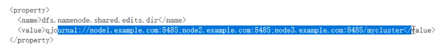 <!-- 指定NameNode元数据在JournalNode上的存放位置 --> <property> <name>dfs.namenode.shared.edits.dir</name> <value>qjournal://node101:8485;node102:8485;node103:8485/mycluster</value> </property>