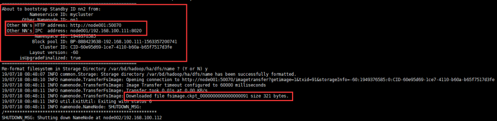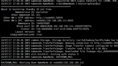# 同步 NameNode1 元数据到 NameNode2 上 (在 node-2 上执行) $ hdfs namenode -bootstrapStandby